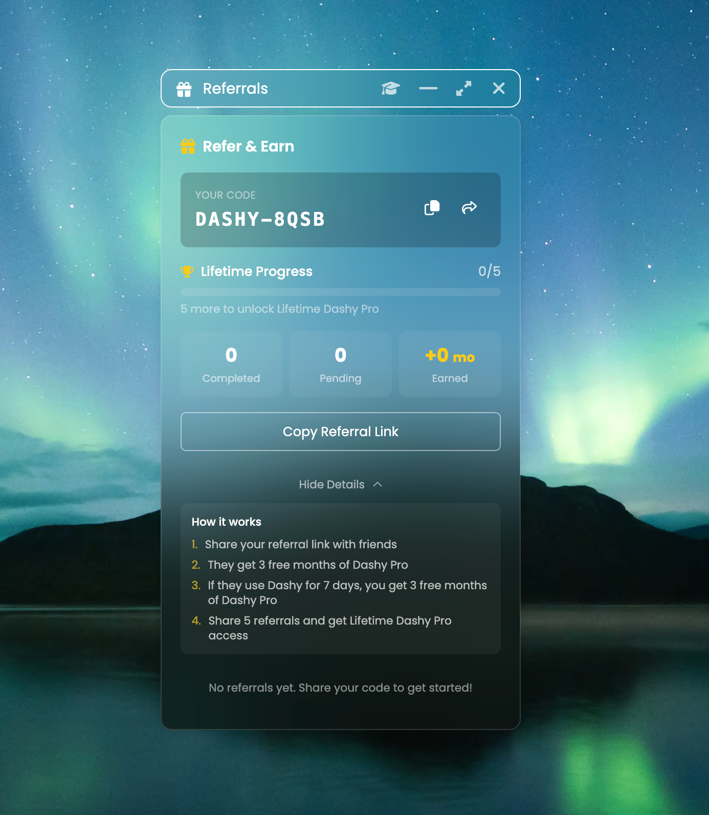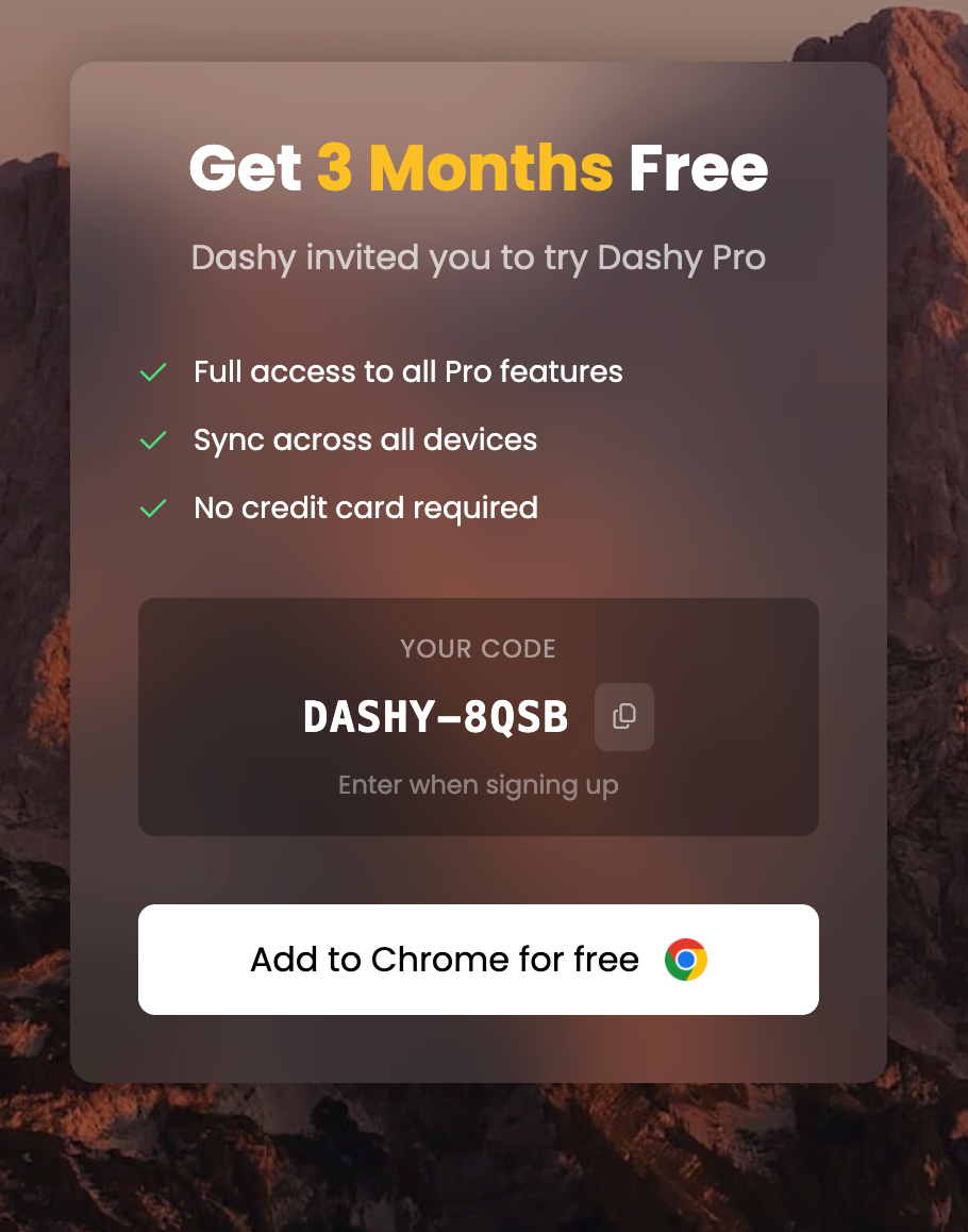 Once a friend signs up and uses Dashy for 7 days, your 3 month Dashy Pro subscription is automatically unlocked.